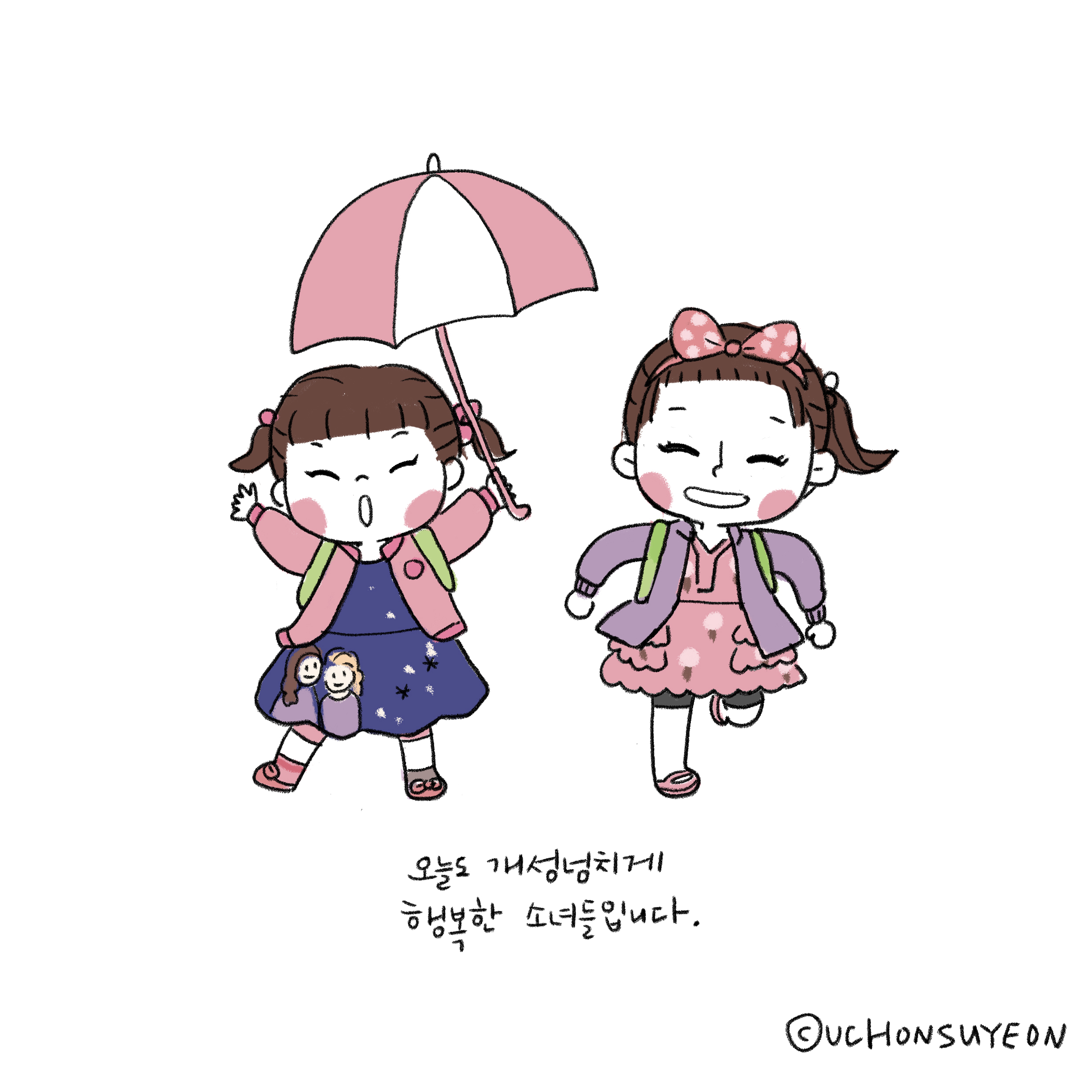 자매들은 그래요. 서로 사랑하면서도 질투하고 시기하지요. 각자 원하는 옷을 입혀놨더니 서로의 옷이 마음에 든다고 하더라고요. 허허. 그전에 분명히 물어볼 때는 싫다고 했던 옷인데 말이에요. 결국 둘이 바뀌 입고 등원했어요. 음. 그래도 한쪽만 바꾸고 싶다고 징징대는 것보다는 훨씬 낫긴 하지요. ㅎㅎ
