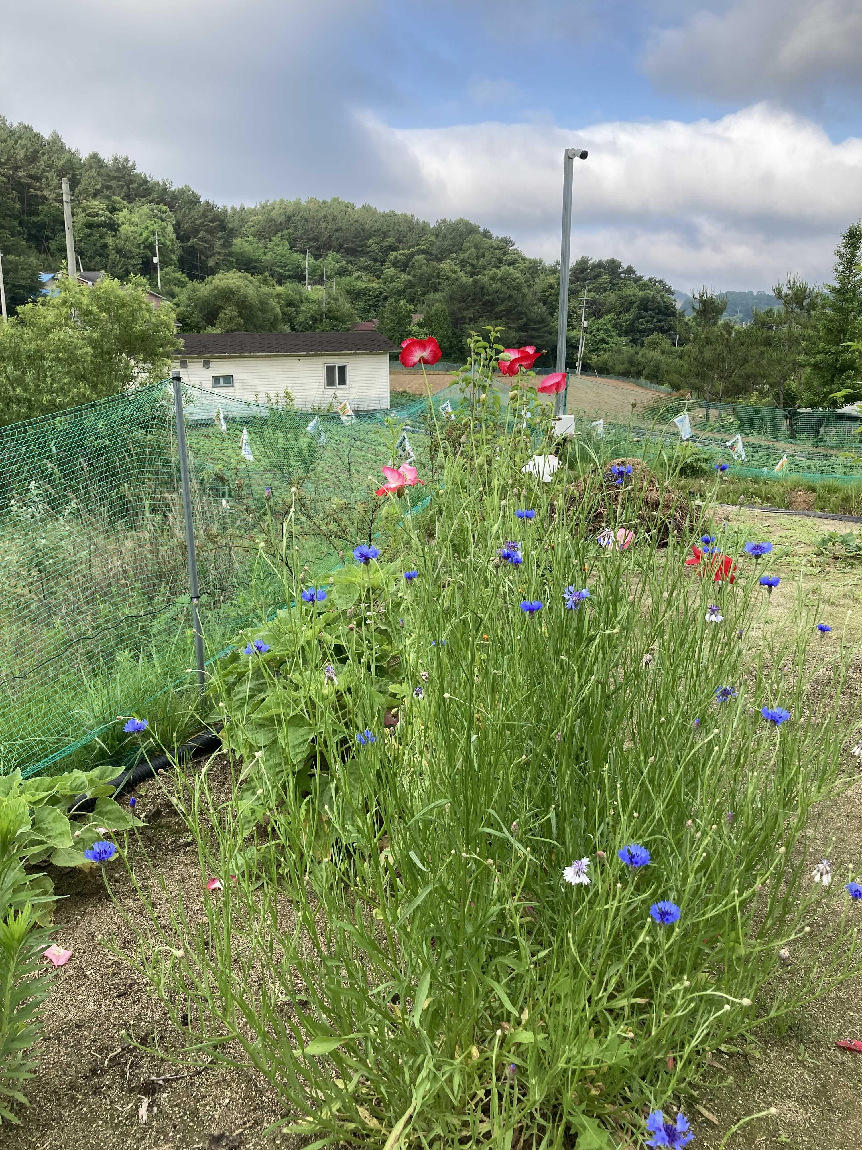 주차장 옆에 심어둔 식물들도 꽃을 피웠다. 코스코스까지도. 아빠말씀이 88올림픽하면서 여름에 피는 코스모스종을 러시아에서 들여왔기때문에 이 계절에도 핀다고 한다. 코스모스 참 이쁜데, 내 밭에 있으면 무섭다. 엄청나다. 성장속도도 그렇고 잠식력도 그렇고 번식력도 그러하다. 무서운 종이다. 쑥대밭만든다는데, 나는 쑥대코스모스밭만든다고 말하고 싶다. 아, 그리고 여기는 퇴비를 덜했는지 서양양귀비가 작게 피고 있다. 안쪽밭 꽃의 1/4 정도인 듯 싶다. 작고 귀여워.